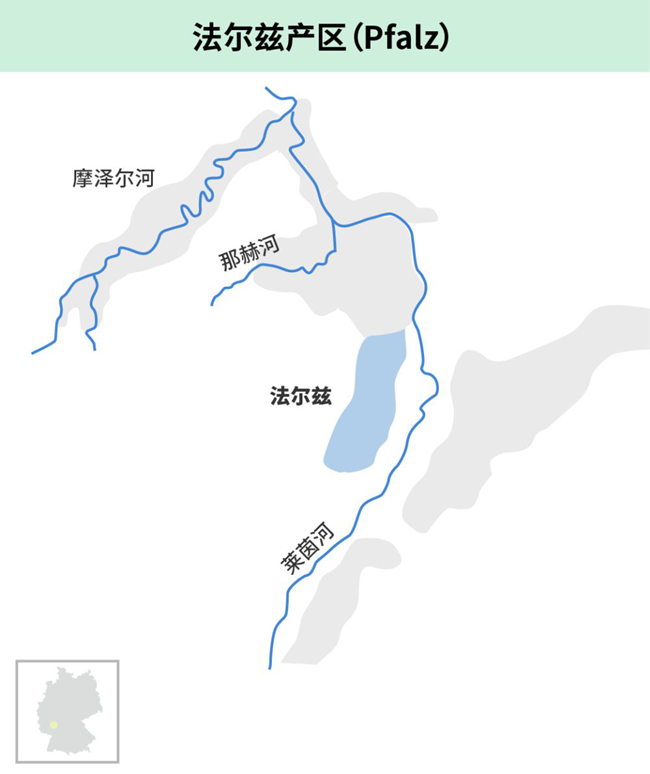法爾茲產(chǎn)區(qū)位于德國的西南部,地處哈茨山(Haardt Mountains)和萊茵河之間,北接萊茵黑森(Rheinhessen),南部、西部則與法國接壤,其葡萄園南北綿延80余公里。從面積上來說,法爾茲是德國第二大產(chǎn)區(qū),但其產(chǎn)量時常能夠占據(jù)13產(chǎn)區(qū)之首。