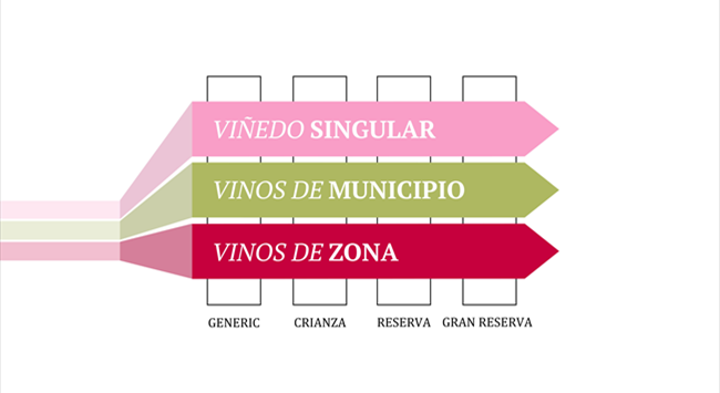 2017年,里奧哈法定產(chǎn)區(qū)監(jiān)管委員會(huì)(Rioja Consejo Regulador)在葡萄酒法規(guī)上推陳出新,新增了地理標(biāo)簽制度。該地理標(biāo)簽制度將葡萄酒分為單一園葡萄酒(Vinedo Singular)、村鎮(zhèn)級(jí)葡萄酒(Vinos de Municipio)和大區(qū)級(jí)葡萄酒(Vinos de Zona)三個(gè)等級(jí),使葡萄酒更能突顯風(fēng)土特征。另外,此次更新也對(duì)原本的陳釀級(jí)別做了一些修改。原來的里奧哈葡萄酒根據(jù)陳釀年限分為新酒(Joven)、陳釀(Crianza)、珍藏(Reserva)與特級(jí)珍藏(Gran Reserva),在這次更新中,“Joven”更名為“Generic”(原產(chǎn)地保障)。