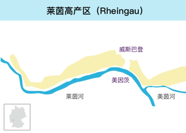 萊茵高是德國(guó)最小但最重要的葡萄酒產(chǎn)區(qū)之一,也是世界上知名的優(yōu)秀葡萄酒產(chǎn)區(qū)。萊茵高位于威斯巴登( Wiesbaden)和勞赫豪森(Lorchhausen)之間,整個(gè)產(chǎn)區(qū)沿萊茵河分布,由西而東地形從寬闊的平原逐漸變?yōu)槎盖偷男逼拢吧謨?yōu)美。