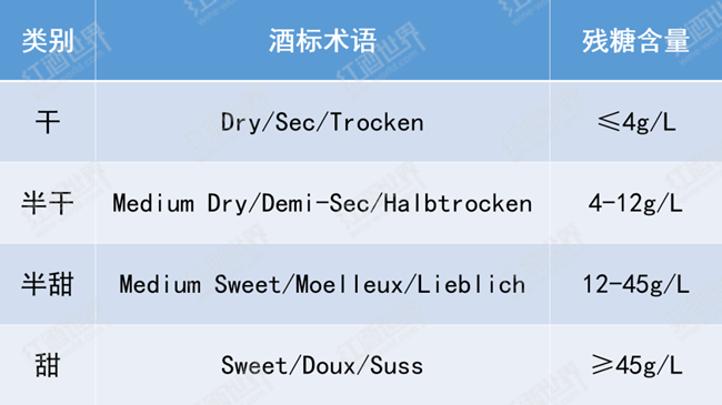 人們根據(jù)殘?zhí)呛繉⑵咸丫品譃榱税ǜ尚驮趦?nèi)的幾個(gè)類別,具體可參照下表。需要注意的是,“干型”葡萄酒并不是完全不含糖,只是含糖量較低,無(wú)法被人所感知而已。