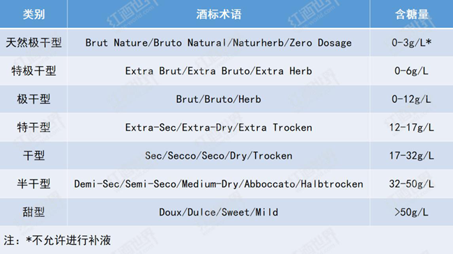 需要注意的是,天然極干型起泡酒是不允許使用含糖的調(diào)味液進(jìn)行補(bǔ)液的,表中0-3g/L的含糖量指的是二次發(fā)酵后酒中殘?zhí)堑暮糠秶?/span>