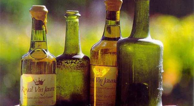 汝拉地區(qū)有生產(chǎn)一種特殊的葡萄酒,被稱為黃酒(Vin Jaune),在國際上的知名度很高,是汝拉人的驕傲。黃酒的瓶子叫 Clavelin 瓶,瓶身矮胖、結實、厚重,容量只有 620ml。黃酒以 100% 的薩瓦涅葡萄為原料,放入老勃艮第橡木桶中發(fā)酵并陳釀 6 年以上,期間不添桶。在木桶陳釀的過程中,酒液表面會產(chǎn)生一層酵母膜(Blanket/Voile),有點像雪利酒的酒花(Flor)。之所以是 620ml 的容量,據(jù)說這是因為黃酒在完成 6 年的陳釀之后,酒液縮減至 62%。