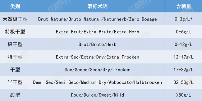 與靜止酒不同,起泡酒根據(jù)糖分含量對(duì)葡萄酒的劃分更為細(xì)致,含糖量由低到高可分為天然極干型、特極干型、極干型、特干型、干型、半干型和甜型七個(gè)類型。在使用傳統(tǒng)法(Traditional Method)、轉(zhuǎn)移法(Transfer Method)或罐中發(fā)酵法(Tank Method)釀造起泡酒時(shí),酒液在最終封瓶或裝瓶前,都會(huì)使用由酒液和糖組成的調(diào)味液(Liqueur d'Expedition)進(jìn)行補(bǔ)液,調(diào)味液中的糖分含量便決定了最終成酒的含糖量,而天然極干型起泡酒在補(bǔ)液時(shí)不允許添加糖分,因此最終成酒糖分含量?jī)H在0-3g/L之間。阿斯蒂起泡酒的糖分含量則由酒精發(fā)酵終止時(shí)酒中的殘?zhí)橇繘Q定。