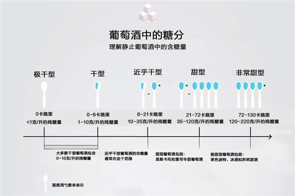 國(guó)際上還有一種通用的量化方法,那就是用勺數(shù)來(lái)表示,詳見(jiàn)下圖。一個(gè)標(biāo)準(zhǔn)勺為 1 盎司(約等于 28.35 克),如下圖所示,干型的殘?zhí)橇糠秶恍蜗蟮谋硎緸?0 勺到 1/3 勺之間,近乎干殘?zhí)橇康姆秶槐硎緸?1/3 勺至1勺+之間。
