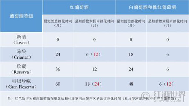 除了跟隨法國和歐盟的腳步之外,西班牙葡萄酒的分級也有著自己的特色,那就是對于DO及以上級別葡萄酒最短的總熟化時間和在橡木桶內(nèi)熟化時間的要求。西班牙根據(jù)熟化時間將葡萄酒分為4個等級:新酒(Joven)、陳釀(Crianza)、珍藏(Reserva)和特級珍藏(Gran Reserva),這幾個術(shù)語也是我們常在西班牙紅酒的酒標上見到的。各級別對于熟化時間的要求見下表: