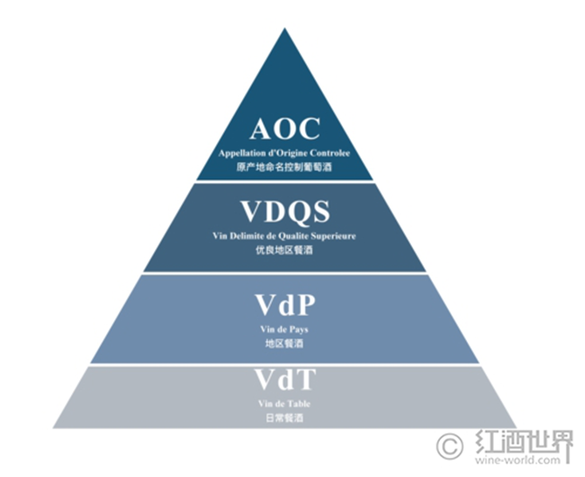 在該分級(jí)體系中,法國(guó)葡萄酒從高到低被劃分成原產(chǎn)地命名控制葡萄酒(AOC)、地區(qū)餐酒(Vin de Pays/VdP)和日常餐酒(Vin de Table/VdT)三個(gè)等級(jí),而后又于1949年在AOC與VdP之間新增了優(yōu)良地區(qū)餐酒(Vin Delimite de Qualite Superieure/VDQS)這一級(jí)別。