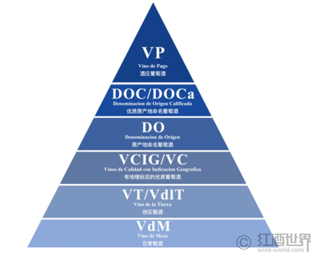 西班牙在20世紀(jì)30年代初期就擬定了原產(chǎn)地命名制度(Denominacion de Origen,簡(jiǎn)稱(chēng)DO),但直到70年代才正式頒布實(shí)施。傳統(tǒng)的西班牙葡萄酒分級(jí)體系和法國(guó)的等級(jí)劃分大有不同,不過(guò)自2003年改革后,其框架已越來(lái)越接近于法國(guó)的分級(jí)體系。西班牙的葡萄酒分級(jí)包含以下6個(gè)級(jí)別: