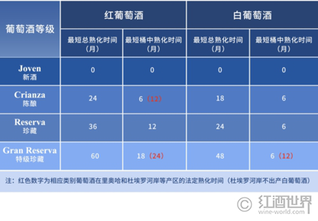 另外,西班牙葡萄酒的分級(jí)也有著自己的特色——規(guī)定了DO及以上級(jí)別葡萄酒的最短總熟化時(shí)間以及桶中熟化時(shí)間。根據(jù)熟化時(shí)長(zhǎng),西班牙葡萄酒分為新酒(Joven)、陳釀(Crianza)、珍藏(Reserva)和特級(jí)珍藏(Gran Reserva)這4個(gè)等級(jí)。