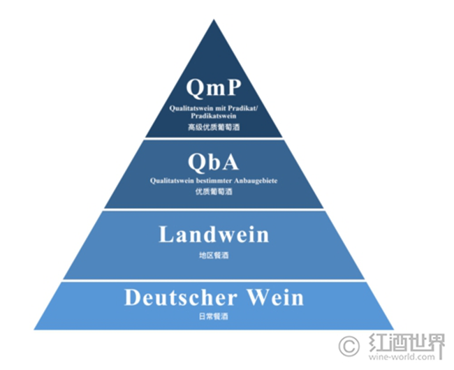簡(jiǎn)單來(lái)說(shuō),德國(guó)葡萄酒分為日常餐酒(Deutscher Wein)、地區(qū)餐酒(Landwein)、優(yōu)質(zhì)葡萄酒(Qualitatswein bestimmter Anbaugebiete/QbA)和高級(jí)優(yōu)質(zhì)葡萄酒(Pradikatswein)4個(gè)等級(jí)。