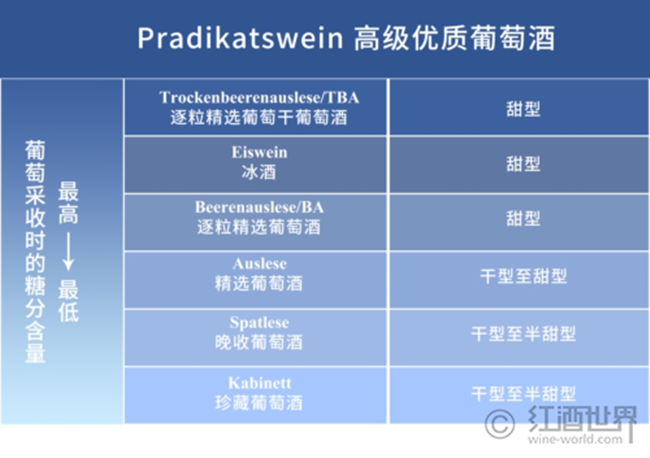 值得一提的是,由于德國(guó)所處緯度較高,氣候較為寒冷,葡萄成熟度對(duì)葡萄酒的品質(zhì)影響重大,所以相關(guān)機(jī)構(gòu)又根據(jù)葡萄采收時(shí)的成熟度,將高級(jí)優(yōu)質(zhì)葡萄酒細(xì)分為以下6個(gè)等級(jí):