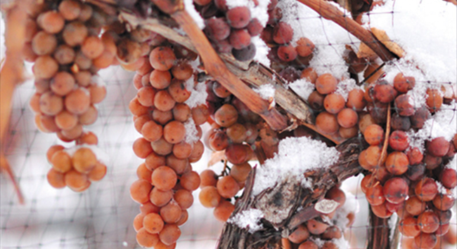 釀制冰酒的葡萄成熟度應(yīng)至少達(dá)到BA的水平,且需在果實(shí)中的水分已結(jié)冰的狀態(tài)下人工采摘和壓榨,以獲得糖分、酸度和風(fēng)味物質(zhì)高度濃縮的葡萄汁。這種情況下壓制出來(lái)的果汁非常少,因此冰酒產(chǎn)量極低,平時(shí)釀造一瓶酒的等量葡萄或許僅能釀制一杯冰酒。因?qū)μ鞖鈼l件要求高,冰酒同樣不是每一年都能釀造的。