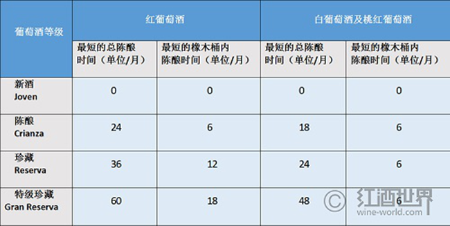 需要注意的是,該表標(biāo)注的只是西班牙規(guī)定的最短陳釀時(shí)間,而有些子產(chǎn)區(qū),如里奧哈(Rioja)和杜埃羅河岸(Ribera del Duero)等,對(duì)總陳釀時(shí)間及(或)橡木桶內(nèi)陳釀時(shí)間的要求一般更高。
