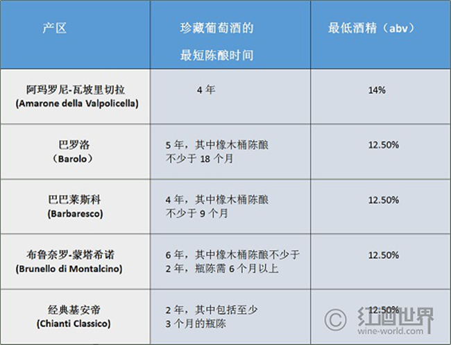 意大利用“Riserva”來表示珍藏,并對(duì)該詞的使用作出了嚴(yán)格規(guī)定。但不同于西班牙,意大利的規(guī)定并不統(tǒng)一,而是依各個(gè)產(chǎn)區(qū)的法規(guī)而定:“珍藏”葡萄酒的酒精度和陳釀時(shí)間均需要超過其所在產(chǎn)區(qū)的法定最低標(biāo)準(zhǔn)。因此,在意大利不同的產(chǎn)區(qū),“珍藏”葡萄酒需要滿足的標(biāo)準(zhǔn)大有不同,具體可見下表: