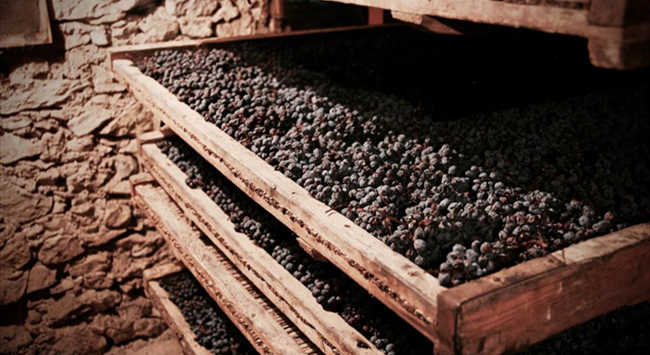 阿瑪羅尼葡萄酒獨樹一幟的風(fēng)格,離不開其令人津津樂道的釀造方法——帕賽托法(Passito Method)。帕賽托法指的是用風(fēng)干的葡萄釀造葡萄酒的工藝,因而又稱枯藤法(Appassimento)。每年葡萄成熟季時,酒莊的工作人員會提前采收葡萄,這時葡萄的酸度還很高,采收后并不急著將它們送去釀酒,而是將葡萄放在通風(fēng)良好的室內(nèi)風(fēng)干幾個月,使果實流失部分水分,糖分和風(fēng)味物質(zhì)得以集中。這種方法可以為成酒增添風(fēng)味、酒體和酒精度。
