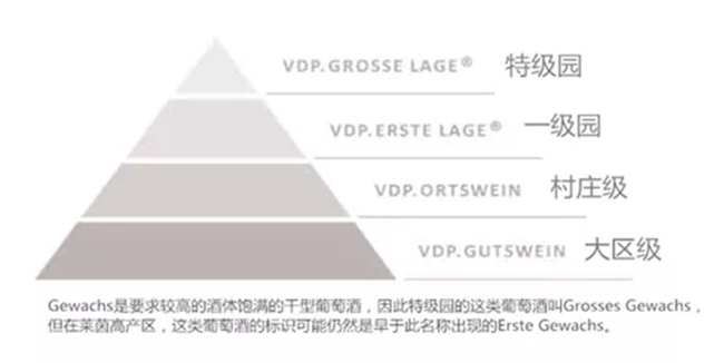 現(xiàn)在越來越能代表德國雷司令葡萄酒級別的是德國名莊聯(lián)盟(Verband Deutscher Pradikatsweinguter,簡稱VDP)倡導(dǎo)的針對葡萄果實(shí)天然特性進(jìn)行的分類,即好葡萄酒不應(yīng)該只擁有足夠高的潛在酒精度,還應(yīng)該具有一定的原產(chǎn)地和其他方面的特色。
