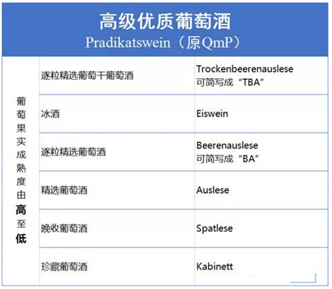 德國與歐洲其他國家最明顯的不同是對最高級別的葡萄酒又根據(jù)葡萄果實(shí)的成熟度進(jìn)行了細(xì)分