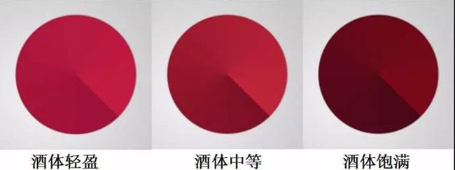 酒體輕盈的紅葡萄酒,如黑皮諾(Pinot Noir)和佳美(Gamay),顏色是從洋紅到石榴紅;酒體中等的紅葡萄酒,如梅洛(Merlot)和桑嬌維塞(Sangiovese),顏色比輕酒體的紅葡萄酒深,有點類似由淺到深的磚紅色;酒體飽滿的紅葡萄酒,如西拉(Syrah)和赤霞珠(Cabernet Sauvignon),顏色深濃,透明度很低。