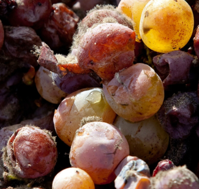 如圖所示,貴腐葡萄身形干癟,表皮還伴有細細的菌絲,若對該類葡萄沒有了解,定會認為這是發(fā)了霉的爛葡萄,但到了葡萄農(nóng)這兒,它就是彌足珍貴的釀酒原料。要成為貴腐葡萄,被灰葡萄孢菌(Botrytis Cinerea)侵染是第一步,但灰葡萄孢菌“亦正亦邪”,在適當條件下,它可以轉(zhuǎn)化為有益的貴腐菌(Noble Rot),反之則有可能化身為誘導果實腐爛變質(zhì)的灰腐菌(Grey Rot)。因此,健康果實感染灰葡萄孢菌的“造化”就全憑清晨是否潮濕多霧、午后是否晴朗干燥來決定了。成功被貴腐菌侵染的葡萄表皮穿孔、水分蒸發(fā),糖分、酸度以及風味物質(zhì)高度濃縮,與風干葡萄有著異曲同工之妙,卻比風干葡萄產(chǎn)量更低、更加難能可貴。