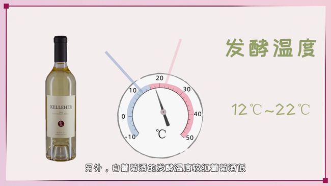 ?、?發(fā)酵溫度較紅葡萄酒低。白葡萄酒的發(fā)酵溫度為12-22℃,此溫度范圍可避免葡萄品種芳香物質(zhì)的流失;而紅葡萄酒的發(fā)酵過程中需要提取葡萄果皮的顏色和單寧,因此溫度較高,為20-32℃。