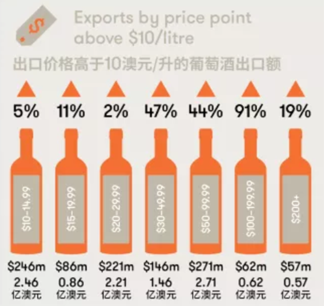 另外一個(gè)突出的部分是價(jià)格區(qū)間在30澳元或以上(離岸價(jià))的葡萄酒出口額的增長(zhǎng),凸顯了市場(chǎng)對(duì)澳大利亞最優(yōu)質(zhì)葡萄酒日益增長(zhǎng)的需求。
