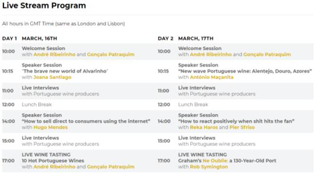 在2020 Prowein宣布取消之后,消費(fèi)葡萄酒活動開始轉(zhuǎn)入線上直播。葡萄牙葡萄酒周設(shè)置兩部分,其中包括一對一的B2B會議以及包括訪談、嘉賓演講者等的實(shí)時直播。