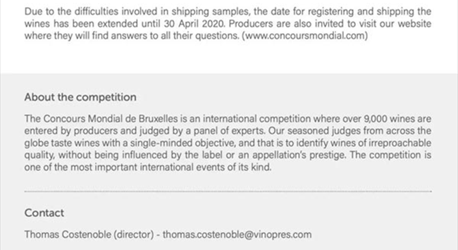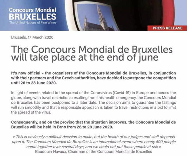 鑒于上述考量,2020年比利時(shí)布魯塞爾國際葡萄酒大獎(jiǎng)賽將延期至6月26日-28日在捷克布爾諾舉辦。