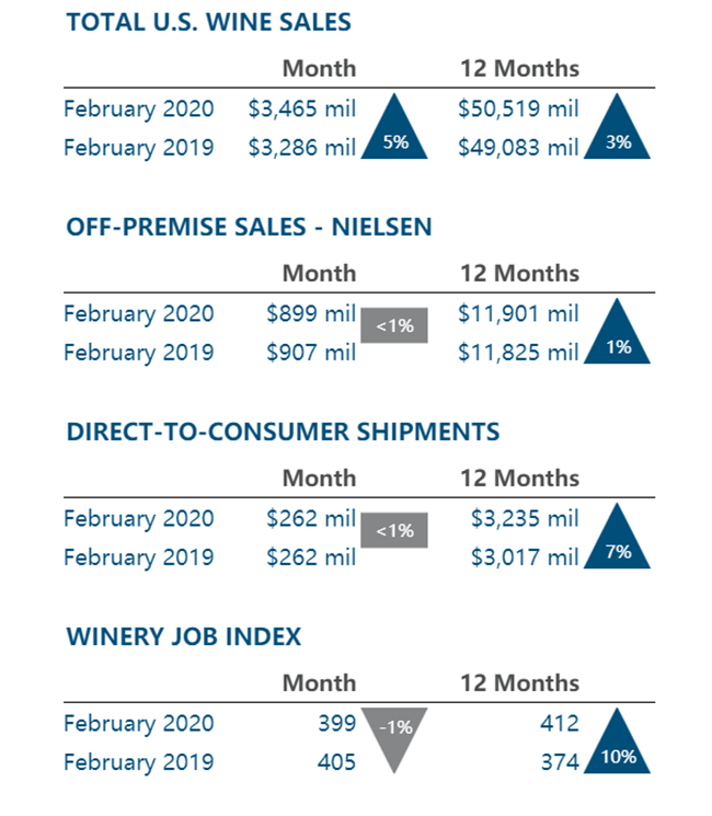 市場(chǎng)研究公司bw166報(bào)告稱(chēng),在過(guò)去的12個(gè)月中(截至2月底),美國(guó)葡萄酒的總銷(xiāo)售額增長(zhǎng)了3%,達(dá)到505億美元,2月當(dāng)月的總銷(xiāo)售額增長(zhǎng)了35億美元。在截至2月22日的四個(gè)星期中,銷(xiāo)售額下降了1%,至8.65億美元。