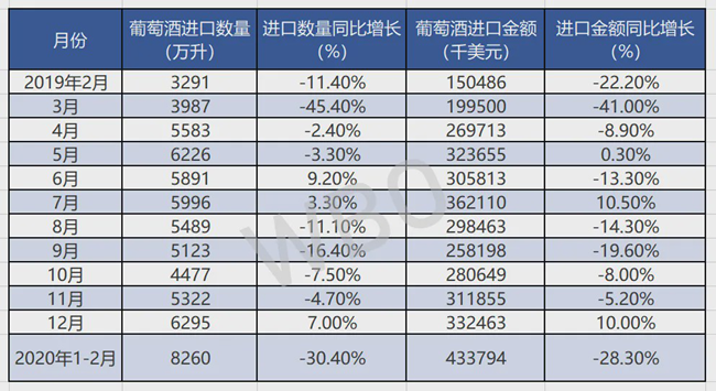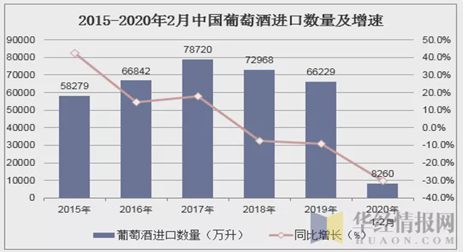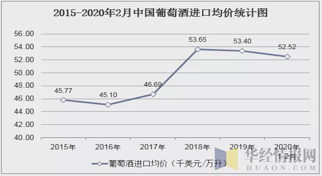 華經(jīng)產(chǎn)業(yè)研究院數(shù)據(jù)顯示:2020年1-2月中國葡萄酒進口數(shù)量為8260萬升,相比上年同期減少了3616.5萬升,降幅為30.4%;進口金額為433794千美元,相比上年同期減少了171071千美元,降幅為28.3%;2020年1-2月中國葡萄酒進口均價為5.252美元/升。