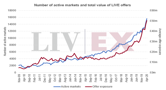 在4月的第一個(gè)星期,隨著更多交易轉(zhuǎn)為在線和,在Liv-ex發(fā)售的優(yōu)質(zhì)葡萄酒總值首次高達(dá)5000萬英鎊。
