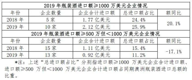 近兩年,頭部企業(yè)對(duì)澳洲酒的持續(xù)加碼對(duì)進(jìn)口葡萄酒市場(chǎng)格局起到了頭雁效應(yīng)。澳洲瓶裝酒進(jìn)口頭部企業(yè)(指進(jìn)口額≥500萬(wàn)美元以上的企業(yè))隊(duì)伍有所壯大,且進(jìn)口額呈正向增長(zhǎng)(5.6%):其中,2019年進(jìn)口額≥1000萬(wàn)美元的10家企業(yè)中9家實(shí)現(xiàn)同比增長(zhǎng),僅1家同比下降;進(jìn)口額≥500萬(wàn)美元的13家企業(yè)中9家實(shí)現(xiàn)同比增長(zhǎng),4家同比下降。