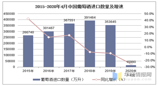 2015-2020年4月中國葡萄酒進口數(shù)量及增速
