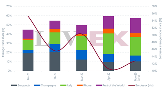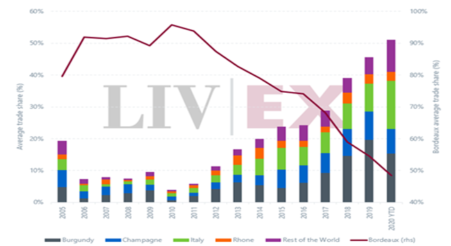長期以來,勃艮第一直是波爾多衰落的主要受益者。 去年,該酒區(qū)的交易份額更創(chuàng)歷史新高 – 全年平均高達20%。 然而,本年至今,這數(shù)字已跌至15%。 在《高峰后的勃艮第》的專題報告中,我們已詳細探討了出現(xiàn)這變化的背后因素。