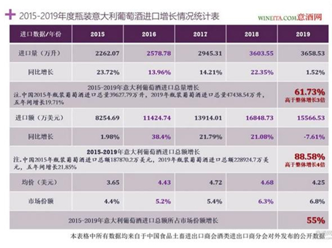 “與美國、加拿大等成熟市場相比,中國為代表新興市場的數(shù)據(jù)變化更能說明意大利葡萄酒逆勢上揚的現(xiàn)象,”意酒網(wǎng)負責(zé)人宮照馥分析稱,“從近幾年的數(shù)據(jù)來看,2015-2018年,中國市場瓶裝意大利葡萄酒進口總額連續(xù)四年增長,只有2019年度相比2018年度下降7.61%。五年間,瓶裝意大利葡萄酒進口總額從2015年的8254.9萬美元,增長至2019年的1.5566億美元,五年間增長88.58%,進口額增長率是同期中國市場瓶裝葡萄酒進口總額增長率的4倍。而從市場份額角度衡量,2015-2019年,中國市場瓶裝意大利葡萄酒進口額所占市場份額,實現(xiàn)連續(xù)五年增長,從2015年的4.4%的市場份額,增長至2019年的6.8%的市場份額。我的預(yù)測是,按照現(xiàn)有的五年市場份額增速55%,意大利的市場份額將增加到10.54%。”