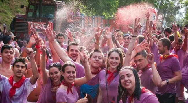 這一天,成百上千人會穿著白色衣服、系著紅色方巾,拿著水槍、噴霧器、水桶等可以裝著葡萄酒的容器作為“武器”,在街道上開始這場“戰(zhàn)爭”。最終他們將衣服染成紫色,“幸存者們”伴隨著音樂返回拉巴斯廣場,享用午餐(特色蝸牛)和美酒。