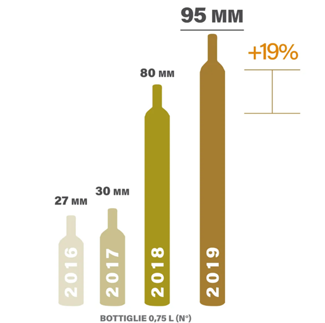 2019年,SICILIA DOC產(chǎn)量超過9500萬瓶(750ml),與2018年相比增長(zhǎng)了19%。
