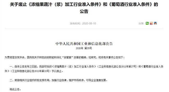 8月10日,中華人民共和國工業(yè)和信息化部發(fā)布公告,稱即日起廢除《濃縮果蔬汁(漿)加工行業(yè)準(zhǔn)入條件》(工業(yè)和信息化部公告2011年第27號)和《葡萄酒行業(yè)準(zhǔn)入條件》(工業(yè)和信息化部公告2012年第22號)。此外,鼓勵相關(guān)行業(yè)組織積極發(fā)揮作用,加強行業(yè)自律,維護(hù)市場秩序,引導(dǎo)企業(yè)健康發(fā)展。