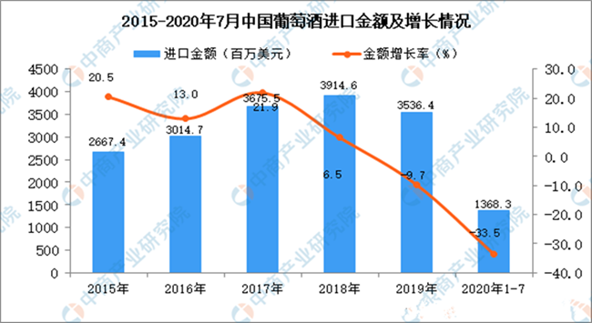 2020年1-7月中國葡萄酒進口量及金額增長情況