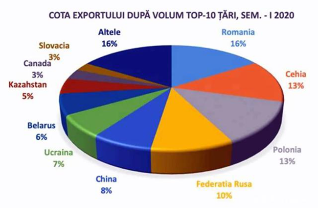 摩爾多瓦向56個(gè)國家和地區(qū)的出口總額為12.478億列伊, 比2019年前6個(gè)月下降了5.7%(即減少了7470萬列伊)。
