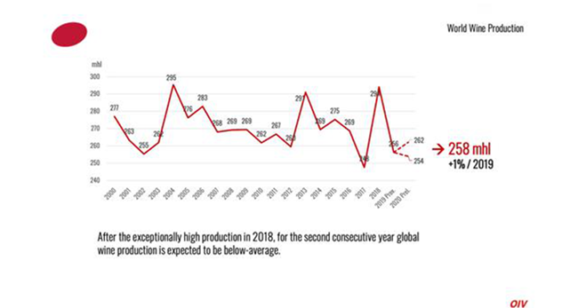 在經(jīng)歷了2018年異常高的產(chǎn)量后,預(yù)計(jì)全球葡萄酒產(chǎn)量將連續(xù)第二年低于平均水平。
