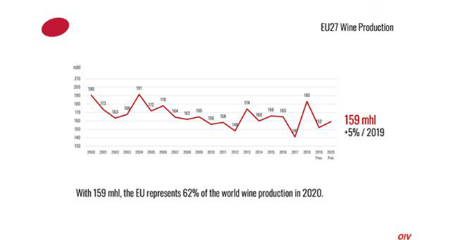 北半球2020年的采收并未受到因疫情封鎖措施的強(qiáng)烈影響。2020年,歐盟國(guó)家葡萄酒產(chǎn)量為159億升(mhl),占全球總產(chǎn)量的62%。