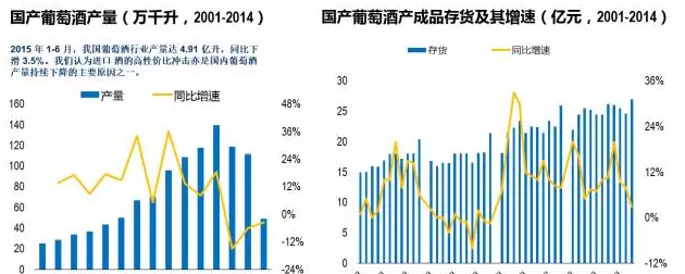 回顧國產(chǎn)葡萄酒的發(fā)展,在經(jīng)歷近十年產(chǎn)量年均17%的高速增長后,2012年到達(dá)頂峰;行業(yè)收入在2001-2012年間年均復(fù)合增速達(dá)23%;2013年,經(jīng)濟(jì)維持低景氣,“三公消費(fèi)”限制加劇,行業(yè)量價(jià)齊跌,處于景氣低谷;同時(shí)產(chǎn)成品同比增速額和庫存壓力處于歷史高位,產(chǎn)量、行業(yè)收入和利潤均出現(xiàn)大幅下滑。但經(jīng)過2014年的庫存消化,行業(yè)產(chǎn)成品存量增速逐步放緩,產(chǎn)量下降速度也開始減緩,收入和利潤出現(xiàn)回升。
