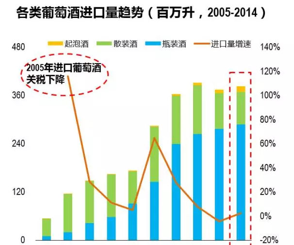 事實(shí)上,從數(shù)據(jù)上看,明顯可以看到三公消費(fèi)及行業(yè)不景氣對(duì)進(jìn)口葡萄酒的影響非常小,相比國產(chǎn)酒2013年的大幅下滑(見圖1),葡萄酒進(jìn)口量在2013年只有很小幅度下滑(見圖3),并在2014年得到恢復(fù)。