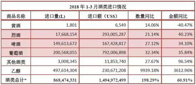 2018年1-3月,進(jìn)口酒類市場延續(xù)高增速,增幅略有回調(diào):除黃酒下行外,各主要酒類保持增勢,烈酒、啤酒、葡萄酒量額均有不小幅度增長。