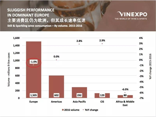 可以看出主要消費區(qū)仍為歐洲,但增長速率已十分低迷。亞洲和獨聯(lián)體國家的增長速度領(lǐng)跑全球。根據(jù)Vinexpo IWSR的預(yù)測,到2021年,中國靜態(tài)葡萄酒的消費量的年復(fù)合增長率將達(dá)到3.3%。將增長23%,達(dá)到1億9300萬箱,其中靜態(tài)酒將達(dá)到1億9280萬箱。