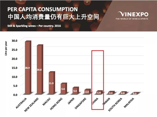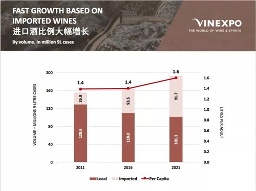 Vinexpo和IWSR對當(dāng)前至2021年全球葡萄酒市場的預(yù)測報告稱,2021年中國葡萄酒消費量將趕超英國,增長39.97%,屆時中國的人均消費量將達(dá)到1.6升。