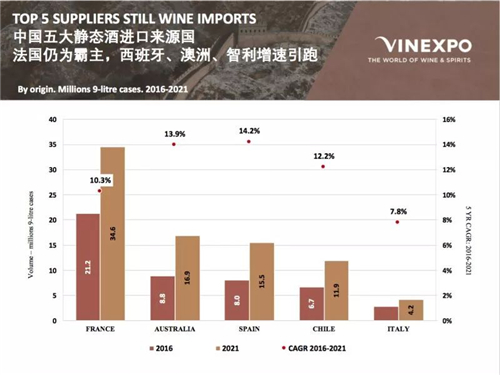 到2021年,在中國進(jìn)口葡萄酒市場,法國仍占據(jù)霸主地位,而西班牙有望趕超智利成為第三大來源國。那么中國的前五大進(jìn)口葡萄酒來源國仍然為法國、澳洲、西班牙、智利和意大利。