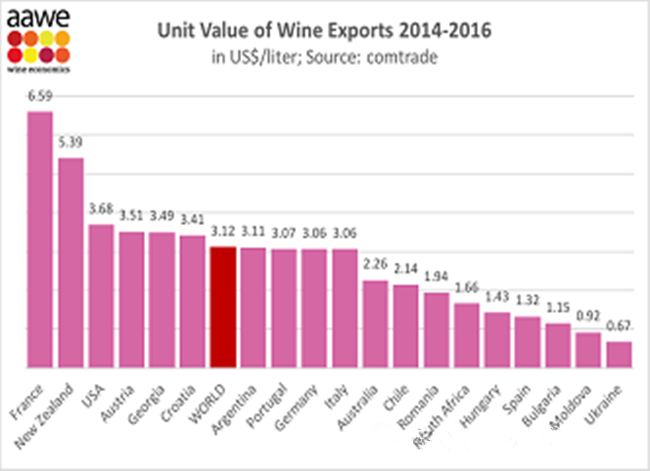 AAWE - 美國葡萄酒經(jīng)濟(jì)學(xué)家協(xié)會(huì)是一個(gè)享有聲望的組織,根據(jù)他們的評(píng)級(jí),法國排名第一(6.59美元),其次是新西蘭(5.39美元),美國排名第三(3.68美元)。奧地利領(lǐng)先格魯吉亞,排名第四(3.51美元)。
