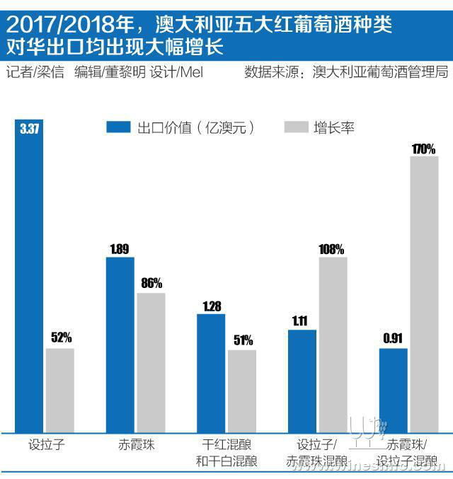 2017/2018年,澳大利亞五大紅葡萄酒種類對(duì)華出口均出現(xiàn)大幅增長(zhǎng)。設(shè)拉子增長(zhǎng)52%至3.37億澳元,赤霞珠增長(zhǎng)86%至1.89億澳元,干紅混釀和干白混釀增長(zhǎng)51%至1.28億澳元,設(shè)拉子/赤霞珠混釀增長(zhǎng)108%至1.11億澳元,赤霞珠/設(shè)拉子混釀增長(zhǎng)170%至9100萬(wàn)澳元。