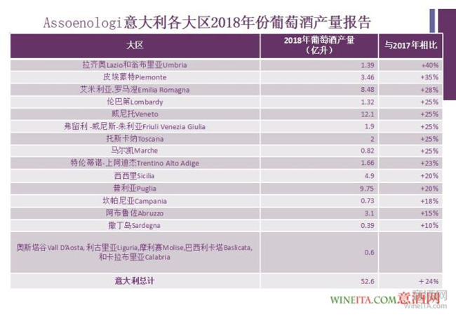 11月中旬,隨著意大利全境葡萄采摘季結(jié)束,意大利釀酒師及釀酒技術(shù)協(xié)會(huì)(Assoenologi)公布了關(guān)于2018年份意大利葡萄酒的產(chǎn)量報(bào)告。基于意大利農(nóng)業(yè)部的官方數(shù)據(jù),該報(bào)告做出結(jié)論:2018年,意大利葡萄酒及葡萄汁產(chǎn)量將比2017年份增長24%,將達(dá)到52.6億升。今年意大利葡萄酒產(chǎn)量的實(shí)際增幅超越了8月末曾發(fā)布的產(chǎn)量預(yù)告,整體形勢(shì)較為樂觀。