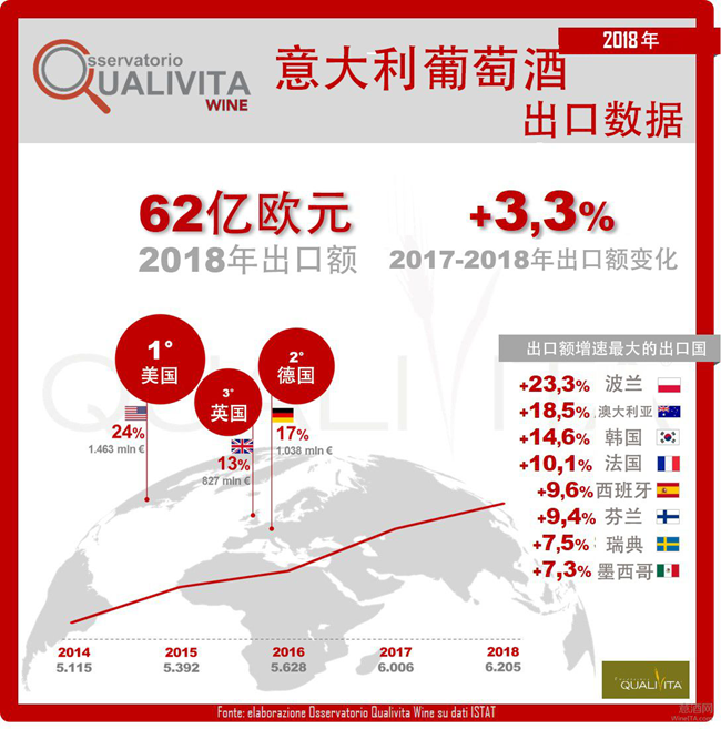近日,意大利葡萄酒聯(lián)合會(huì)觀察委員會(huì)(Osservatorio del Vino di Unione Italiana Vini)和意大利農(nóng)業(yè)和食品市場(chǎng)研究所(Ismea)聯(lián)合發(fā)布了2018年意大利葡萄酒出口報(bào)告。報(bào)告顯示,2018年,意大利葡萄酒的出口總額達(dá)到62億歐元,比2017年同比上升3.3%。歐洲市場(chǎng)占意大利葡萄酒出口額的61%(同比2017年增長3.2%),美洲市場(chǎng)占31%(同比增長3.3%),亞洲市場(chǎng)占7%(同比增長2.4%)。